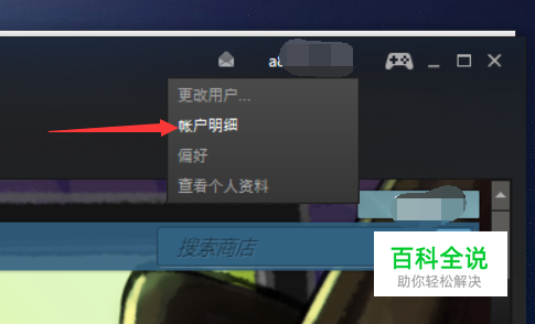 登陆steam,点击客户端右上角“账户名”,在弹出的框中选择“账户明细”。