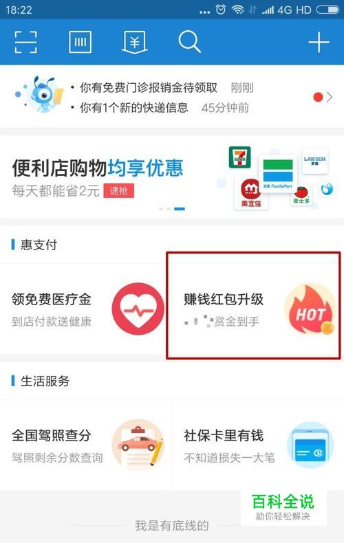 在惠支付栏我们可以看到“赚钱红包升级”的按钮,我们点击进入。