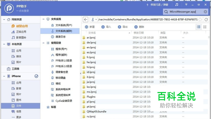 一、依次进入:文件→文件系统(越狱)→ /var→/mobile→/Applications→微信,然后进入【MicroMessenger.app】这个文件中。你如果嫌麻烦可直接搜索MicroMessenger.app,然后按下回车键,也同样能够改文件。