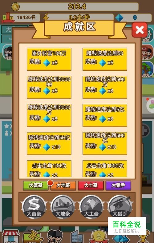 进入小小首富游戏,打开成就的面板,切换到大富豪,达到累计财富、赚钱速度、点击主角的次数的目标,就能获得钻石,如图所示
