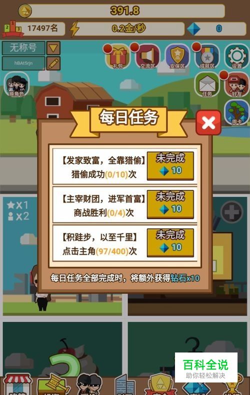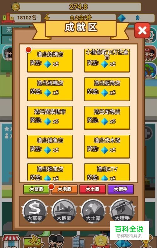 切换到大地豪,通过造出建筑、手动抓获小偷次数、投资土地次数,点击赚取金币数目、小偷偷取金币的数目,达到目标就可以获得钻石了,如图所示