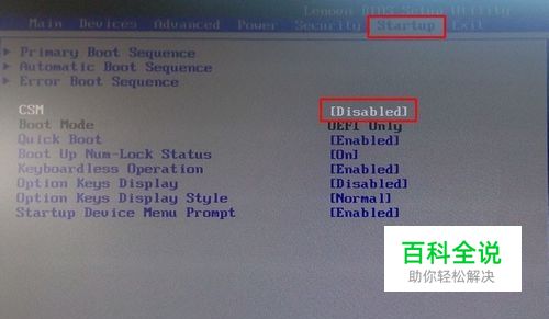 按开机键后不停的按F1进入BIOS界面。 键盘方向键向右移动到BIOS"Startup"菜单,然后选择“CMS”按回车键。