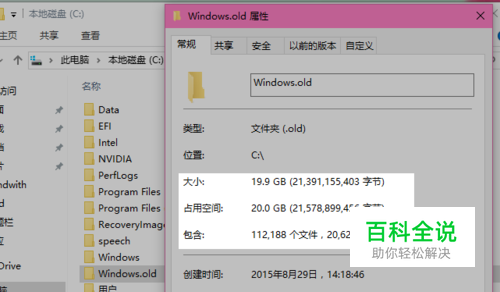 我们在 Windows.old 文件夹上右键-->属性,会弹出文件夹属性对话框并计算文件夹所占磁盘空间的大小。看看,的确不小吧,20 个 G。