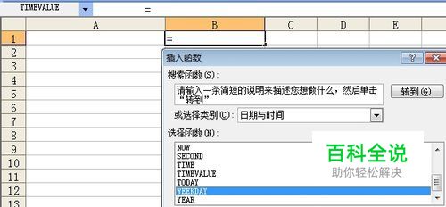 单击B1单元格,点插入函数命令,弹出插入函数设置框,在其中选择【日期与时间】分类中的WEEKDAY函数。点击确定按钮。