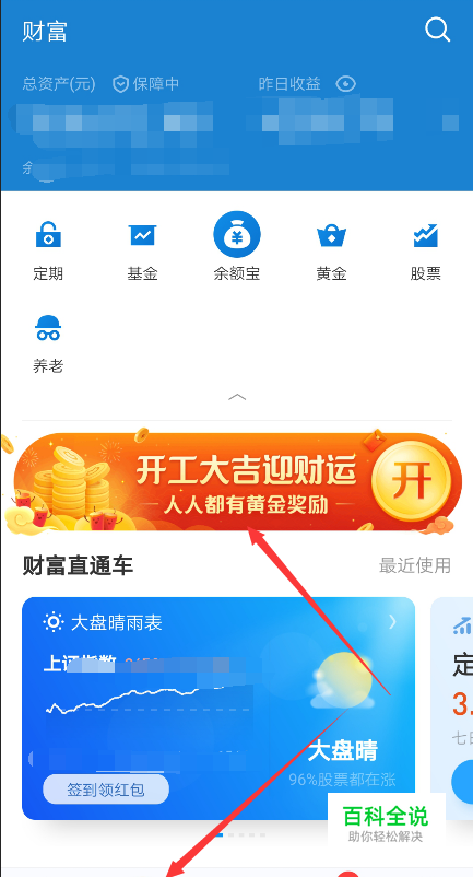要是在支付宝首界面没有看到,直接点击支付宝底部的【财富】,然后在支付宝财富界面里直接点击【开工大吉迎财运】,如下图所示。
