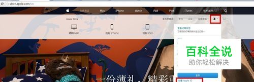点击右上角的菜单栏,点击以后就会出现下拉框,包括了“你的订单、退货”等信息,如果你有账号就可以直接登录,如果没有,下面就有一个创建“apple ID”!