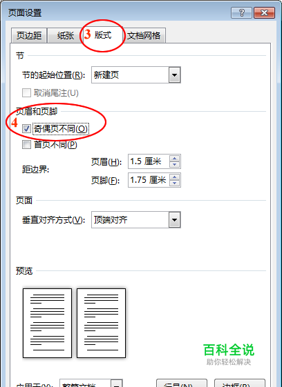 在弹出的对话框中,点击“版式”选项卡,在“页眉和页脚”设置中,选中“奇偶页不同”复选框(即单击打上对号)。然后点击确定。