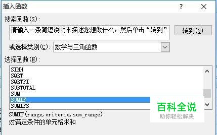 在或选择类别下拉列表中选择数学与三角函数选项 在列表框中选择sumif选项