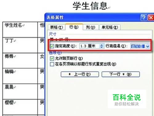 右击Word 2003表格第一页左上角的全选标识,选择“表格属性”。在“行”标签页中,勾选“指定高度”项,并将其改为“1.3、固定值”。“确定”后即将其调整为每页18行。