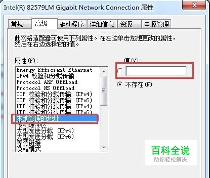 然后,在高级标签下会看到属性列表(如下图),在属性列表中查找到“本机管理的地址”,点击。在右边会看到“值”和“不存在”两个选项。