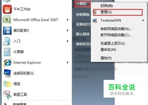 首先,通过开始菜单,选择“计算机”,右击,选择“管理”。(如图)