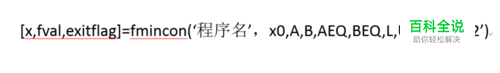 解释如下: 输出x为解的结果 输出fval为目标函数的最小值 输出exitflag为解的情况(大于0表示求解成功) 程序名用于写目标函数 x0为初始向量 A、AEQ为系数矩阵(A为不等式约束,AEQ为等式约束) B、BEQ为常数项向量(B为不等式约束的常量,BEQ为等式约束的常量) L为解的下限 U为解的上限 程序2用于非线性约束