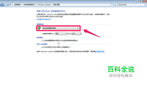 1、更新win7操作系统;在控制面板窗口找到“windows UPdate”选项,找到“更改设置”选项,在更改设置窗口,找到“重要更新”栏目,在下拉菜单框中选择"自动跟新"选项,然后点击确定按钮,如下图所示;