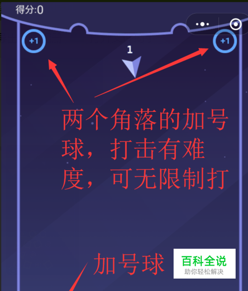 最重要的,利用好左上和右上角的加号球,其可提高发射小球数,可以无限次数打击。如下图,当可发射小球远大于某一形状可击打数时,且该形状靠近边界,如下图左上角的圆形,等其再向上运动一行后,按图示箭头角度进行击打,可打到上方加号,极大的补充每局的可发射小球数。