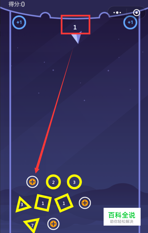 多打加号球。打开游戏,开始时上方箭头数字显示1,即每次弹射只发射一个小球,如果界面中有加号图标小球,瞄准其发射,可增加发射小球数。尽量每次发射,能打到加号小球同时,多打到其他形状。这一加号球,打一次即消失。