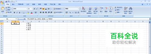 现在我们要做的是通过输入前面的id能够找到我要的后面人物名称的信息,这就可以理解为通过id去查询人物姓名。 具体怎么使用呢,我们先展示,我们可以在要显示的单元格内输入 =VLOOKUP(A1,$C$1:$D$4,2,TRUE), 然后按住Enter键,是不是没有效果。别着急,看下面的叙述。