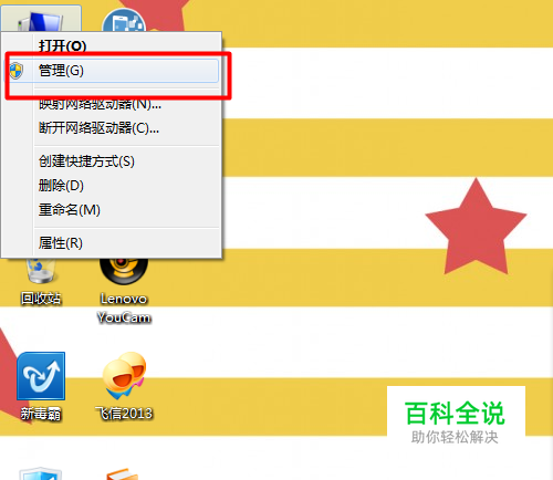首先,右击你电脑桌面上的计算机图标,在弹出的菜单中选择管理选项。