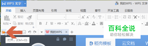 打开wps后,点击开始选项卡中图示的【打开】按钮。