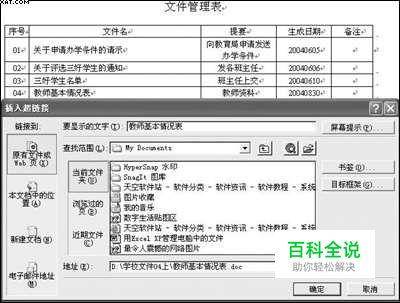 运用Word管理 在Word中新建一个表格,在表格中输入文件名、提要和生成日期,然后选中文件名后单击鼠标右键,在弹出的快捷菜单中选择“超链接”命令,接着出现“插入超链接”对话框,在“查找范围”框中找到所要链接的文件,单击“确定”按钮后,表格中的文件名就与文件建立了超链接,如图1所示。图1 Word中插入超链接 把所有文件都建立了超链接后,将表格保存在桌面上,下次要打开文件时,只要在文件管理表中找到相关的链接,就可以轻松地打开,再也不用到硬盘上到处去寻找了。