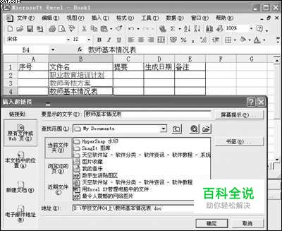 用Excel进行管理 上面的方法操作简单,但有一个缺点,那就是当文件过多时,表格中的行数也特别多,查找起来仍然很繁琐,这时我们就可以利用电子表格中建立多个工作簿的特点来进行管理。 在Excel中,用文件夹名称建立多个工作簿,然后在每个工作簿中把文件列成表格,给每个文件名建立一个超链接,链接到硬盘中相关的文件,以后要打开文件时直接单击对应的文件名即可,如图2所示。图2 Excel中插入超链接 Cico提示:当你硬盘中的文件很多时,可以建立多个工作簿来对应不同的文件夹,建议以生成文件的时间(如季度或月)来建立。