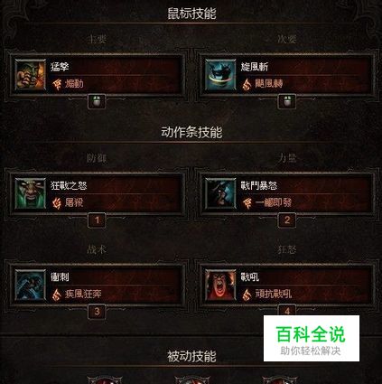 最后的一个被动技能的选择可以根据你目前的装备情况而定。如果护甲太低可以选择使用钢铁胆识和意志坚定;如果抗性太低可以选择迷信;击中生命回复不足可以使用嗜血狂人或激励风采;其他被动中争战者和奋战不懈都是很好的辅助选择。