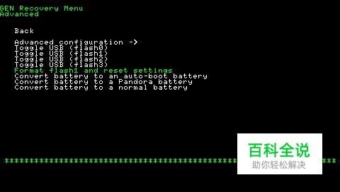在恢复模式/恢复菜单中直接选择来格式化Flash1 机型为1000/2000非V3并且系统为自制系统的机型 将PSP关机 按住R键开机进入恢复模式 按↑↓方向键移动至advanced 选择advanced这个选项 再选择Format flash1 and reset settings 等片刻即可完成对Flash1的格式化 机型为2000V3/3000且系统为自制系统的机型 在XMB下按住select进入vsh菜单 再选择recovery menu进入恢复菜单 再选择advanced(如果没有看到下面的界面就尝试选run program at...) 再选择Format flash1 and reset settings 等片刻即可完成对Flash1的格式化
