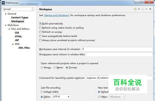 更改文件编码 1)在Window--> Preferences的左上角,输入encod 选择Workspace,文字编码改为UTF-8