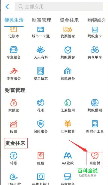 进入到全部应用,往下面滑动,找到资金往来,可以看到亲密付;