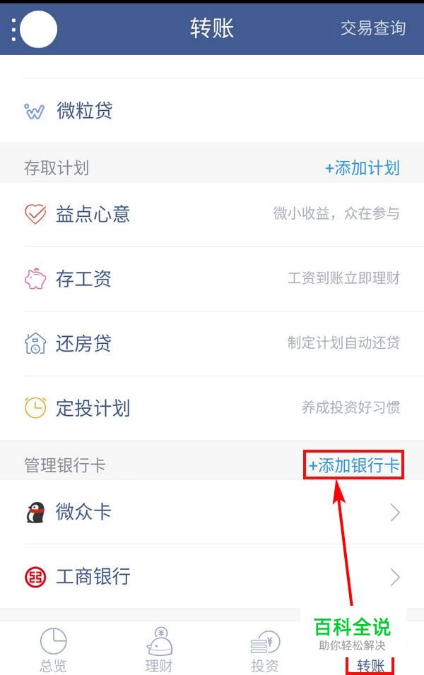 打开微众银行,点到“转账”页面,滑到下方“管理银行卡”,点击“+添加银行卡”;