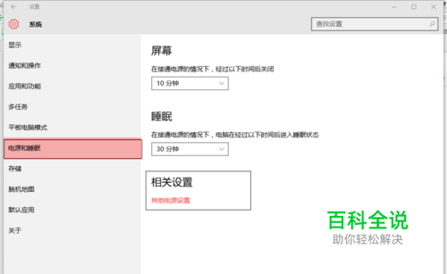 首先,点开设置,这里就不多说设置在哪里了,然后从设置页面左侧点开“电源和睡眠”,再点开“其他电源设置”