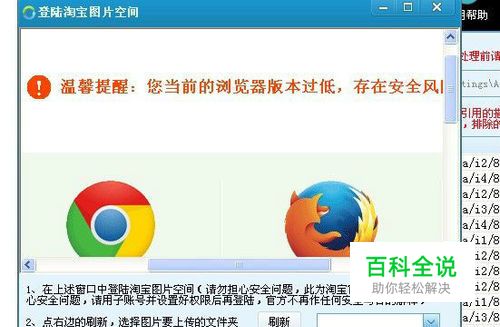最近有一部分店主,在使用大淘营搬家工具,或者大淘营宝贝复制工具,登录淘宝图片空间的时候出现:“您当前的浏览器版本过低,存在安全风险......” 如图: