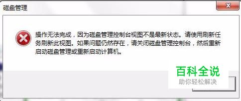 出错提示:操作无法完成,因为磁盘管理控制台视图不是最新状态。请使用刷新任务刷新此视图。如果问题仍然存在,请关闭磁盘管理控 制台,然后重新启动磁盘管理或重新启动计算机。