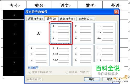在“自定义编号列表”对话框中的“编号格式”框内把显示的原编号删除,然后输入“61”这两个数字,再到“编号样式”列表框中选择“01,02,03”样式,最后点“确定”退出。就会按照从上到下(或从左到右)的顺序从6101开始自动填充考号了。