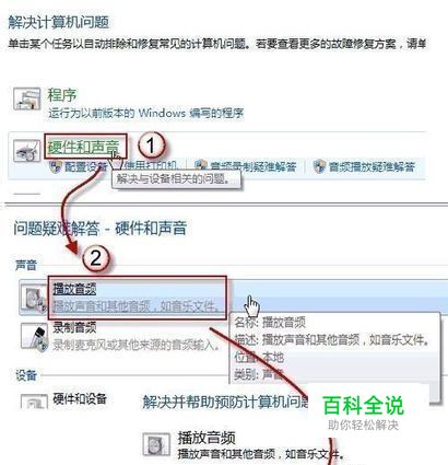 打开硬件和声音,在声音选项下,选择播放音频;在播放音频对话框中,点击下一步