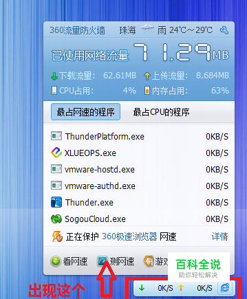 我们来测试一下网速,点击右击360图标——再点击显示流量防火墙悬浮窗