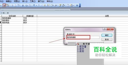 然后点击保存按钮,在弹出的对话框中输入一个表文件名,如“我的数据库”,确定