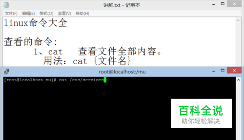 cat 查看文件内容,查看内容过多文件的时候不能全部显示,如图中2中想要查看/etc/services的内容,使用cat查看后(图3)发现不能全部显示只能显示最后一屏内容。所以cat一般用于查看文件内容非常少的文件,用法以及事例大家看图即可。