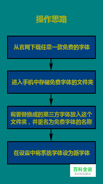 在荣耀 8 中,要想成功地更换为第三方字体,我们需要“曲线救国”,其大体思路如下图: ● 从官网下载任意一款免费的字体 → ● 进入手机中存储免费字体的文件夹 → ● 将要替换成的第三方字体放入这个文件夹,并更名为免费字体的名称 → ● 在设置中将系统字体设为新字体 特别说明:当我们按这种思路操作时,由于无需更改任何系统设置和系统文件,因此不必对手机进行 root,更换字体后系统运行相当稳定,就和原装系统一模一样。