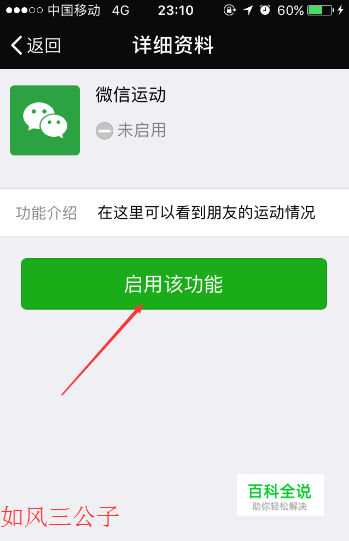 用户想要隐藏自己的微信运动步数,首先根据需要自己关注了微信运动,关注之后点击“启动该功能”按键。