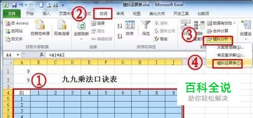 选中“A4:J13”单元格,点击“数据”=〉“模拟分析”=〉“模拟运算表”,如下图所示: