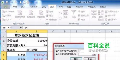 弹出“模拟运算表”对话框,在“输入引用列的单元格”文本框中点击“A5”,如下图所示:
