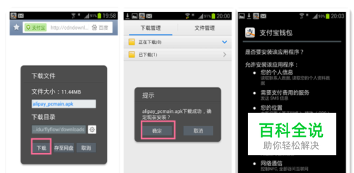 在浏览器 点击《下载》,下载完成后点击《安装》,再次确认《安装》,这样就完成了手机支付宝钱包的下载和安装。