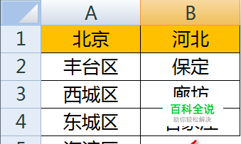 设置完毕后,A2单元格选择“河北”时B2的下拉菜单返回“河北”的信息;A2单元格选择“北京”时B2的下拉菜单返回“北京”的信息。