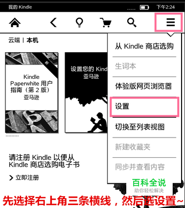 打开kindle主页面,点击右上角,工具栏中第三栏进入设置界面。