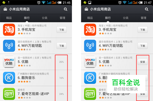 如图所示:比如我下载了优酷、酷狗、爱奇艺这三个APP,下载完成之后,我并没有立刻安装,那是因为一旦安装之后,不一定能找到这几个APP的安装包,因为小米应用商店有可能会默认删除已下载的安装包,删除安装包主要是为了释放手机存储空间,除个别APP他无法将其删除 :