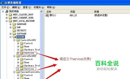 2、在注册表编辑器里system下找到controlset001,controlset002,currentcontrolset下面的services文件下,找到mysql,将其删除