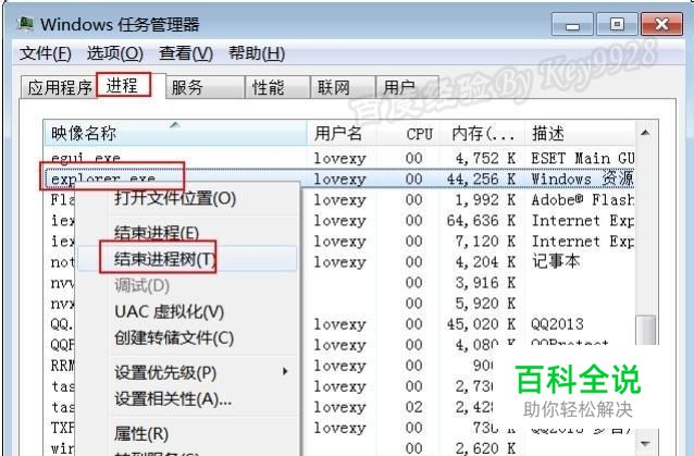其实你可以尝试按ctrl+shift+esc键打开“任务管理器”,切换到“进程”,再右击“explorer”,选择“结束进程树”: