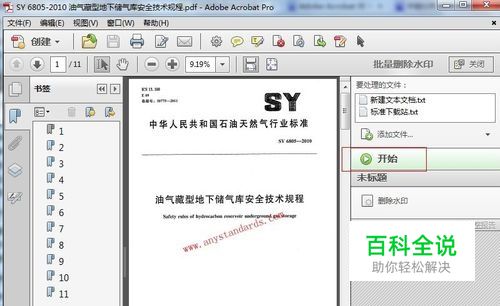 开始进行水印删除的操作: 回到步骤2那副图(本文第2附图),选择右侧的“批量删除水印”,弹出对话框(如下图),点击“开始”,Adobe Acrobat XI V11.0.0会自动化的删除水印了。 Enjoy it!