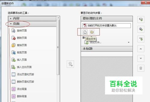 在弹出的“创建新动作”对话框中,依次找到 页面 → 删除水印 ,右侧可以选择你要删除水印的文件或文件夹;本例以文件为例,点击框框中左侧的图标,进入步骤4