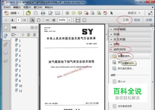 用Adobe Acrobat XI V11.0.0打开任意有水印 pdf一篇,如下图;依次选择 工具 → 动作向导 →创建新动作,